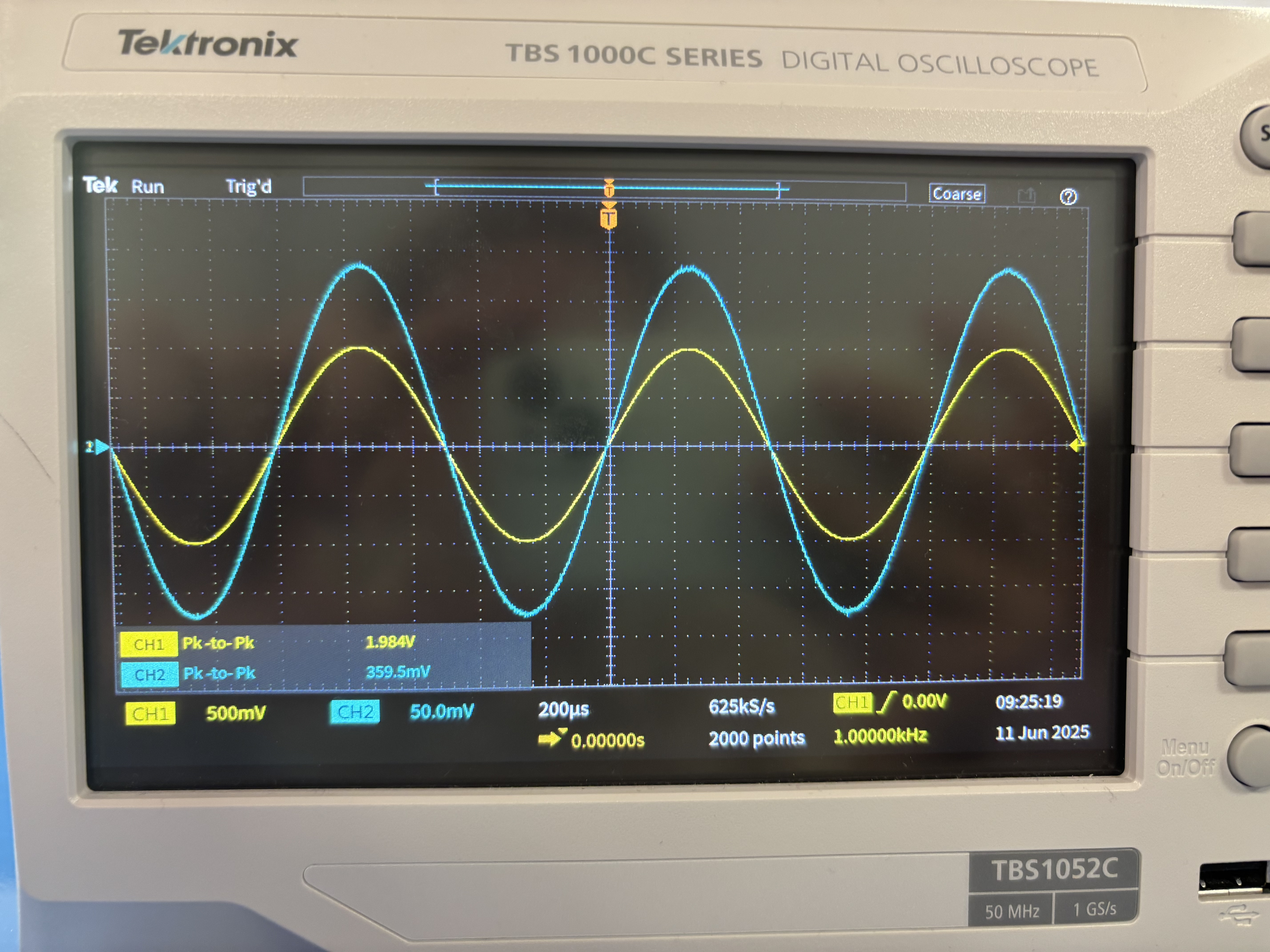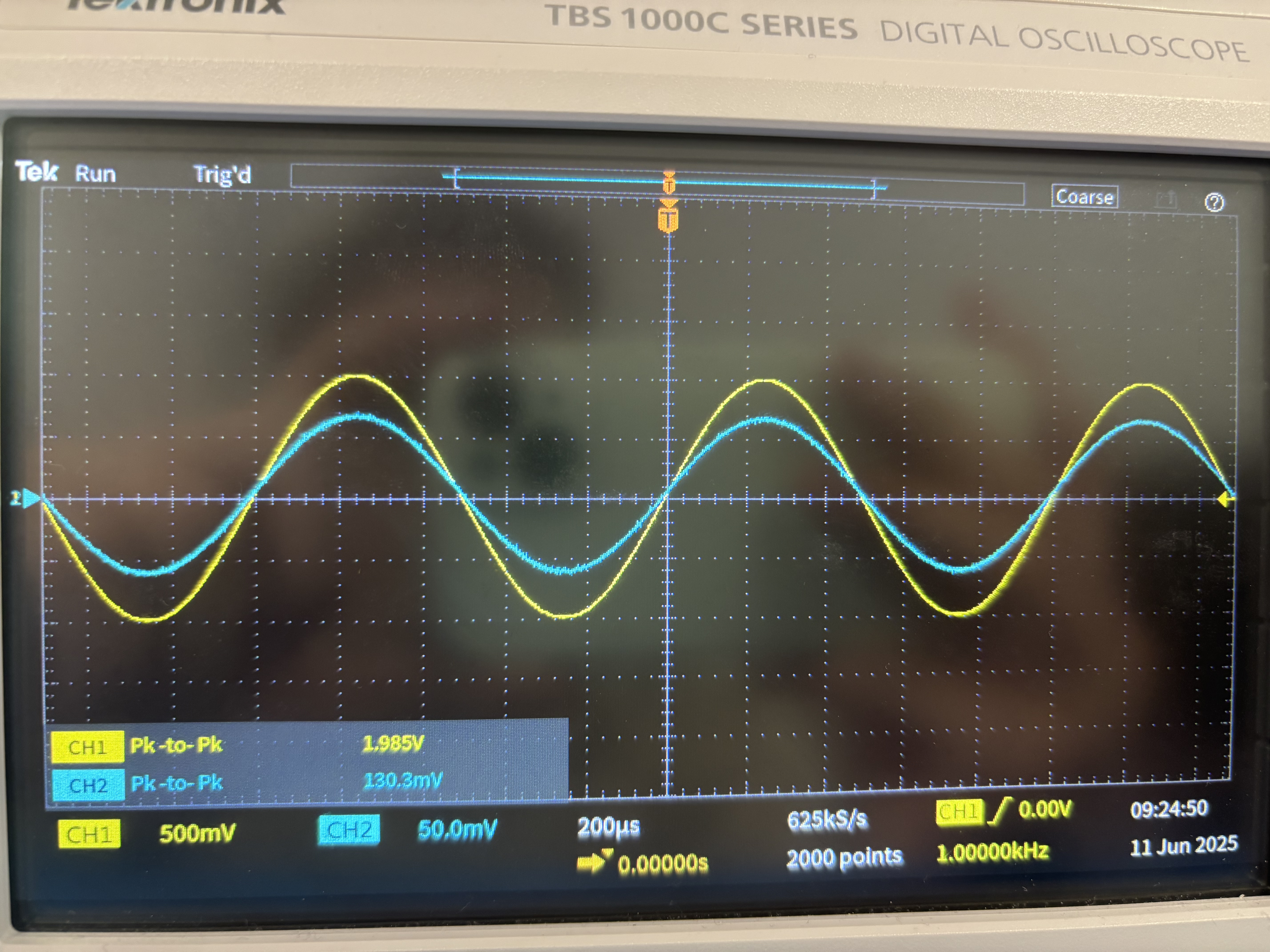 1. Un signal d'entrée sinusoïdal de fréquence $1 \text{kHz}$ a été appliqué.