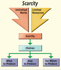 | Resources rares: la notion de rareté est la base du problème économique. En fait, elle résulte de la quantité limitée des ressources dont disposent les êtres humains et le caractère insatiable de leurs besoins | Mode d'affectation des ressources: production, distribution, répartition et consomation des biens et aussi des institutions et activités en ayant |
